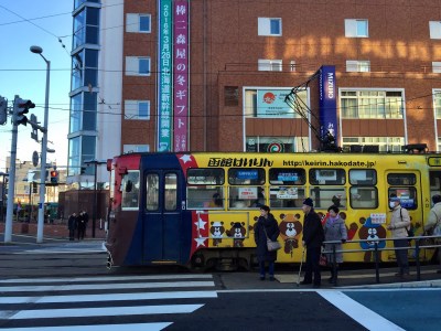 Not relishing the 1.5 hour wait in Oshamanbe Station if we wanted to take the train from Kutchan (Niseko) to Hakodate, we decided to fork out 60,000 Yen for the 8 of us to travel in mini-van comfort. It was snowing when we left Niseko so we were pleasantly surprised at the sunny, autumny weather we encountered at the Yakumo (八雲) Panorama Park rest-stop along the way. Doffing our heavier ski wear and down jackets, we thought we would enjoy the same balmy conditions when we got into Hakodate. Five minutes waiting for the tram outside our hotel convinced us to return to the room to don back our heavy duty winter clothes.