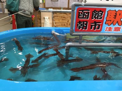 So we discovered that Hakodate is really Squid Town, what with almost every restaurant here serving up a squid dish of sorts. The morning market is no exception and this is where you can experience the thrill of live squid fishing, for those who never had the chance to try it before. After you catch one, the staff will deftly draw and quarter the poor squirming creature, pour soya sauce on its remains to make the tentacles dance a bit more and serve it up to you for your breakfast. I am surprised the Society for the Prevention of Cruelty against Squid aren’t up in arms and calling for the boycotting of travel to Hakodate.