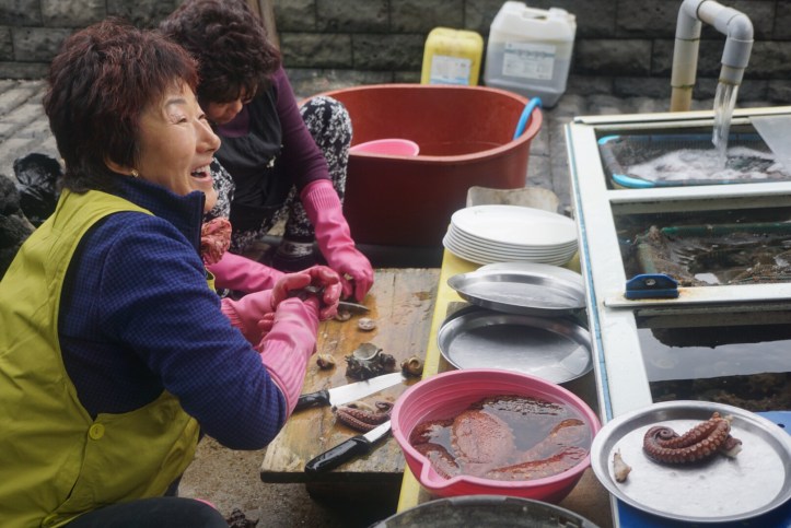 So besides the Seongsun Ilchubong peak to be scaled, the place is also famous for diving women (Haenyo) who apparently will put on some diving performance twice a day. When we were there around noon, all the Haenyo were bundled up in sweaters and huddled in a circle downing soju. Definitely a better idea than heading into the cold, raging waves crashing against the black volcanic sand beach. With no upcoming performance, the alternative was to stumble into their “hut” and partake of some of the sea creatures they had netted.
