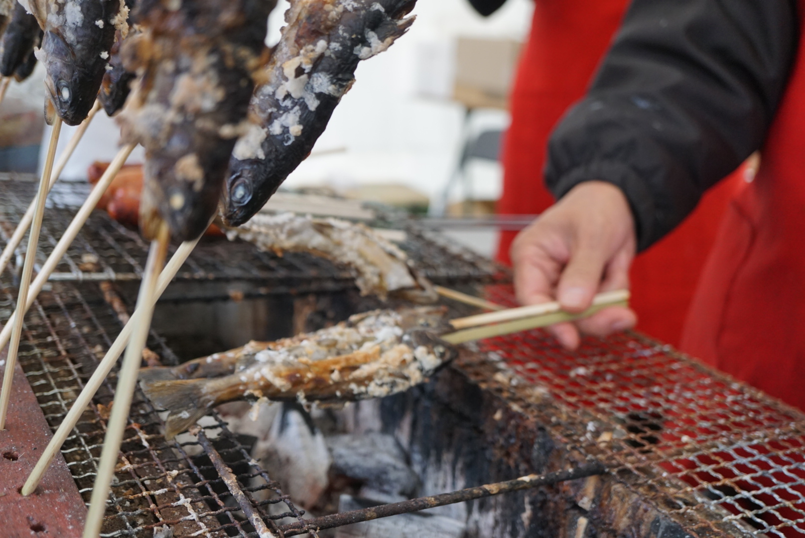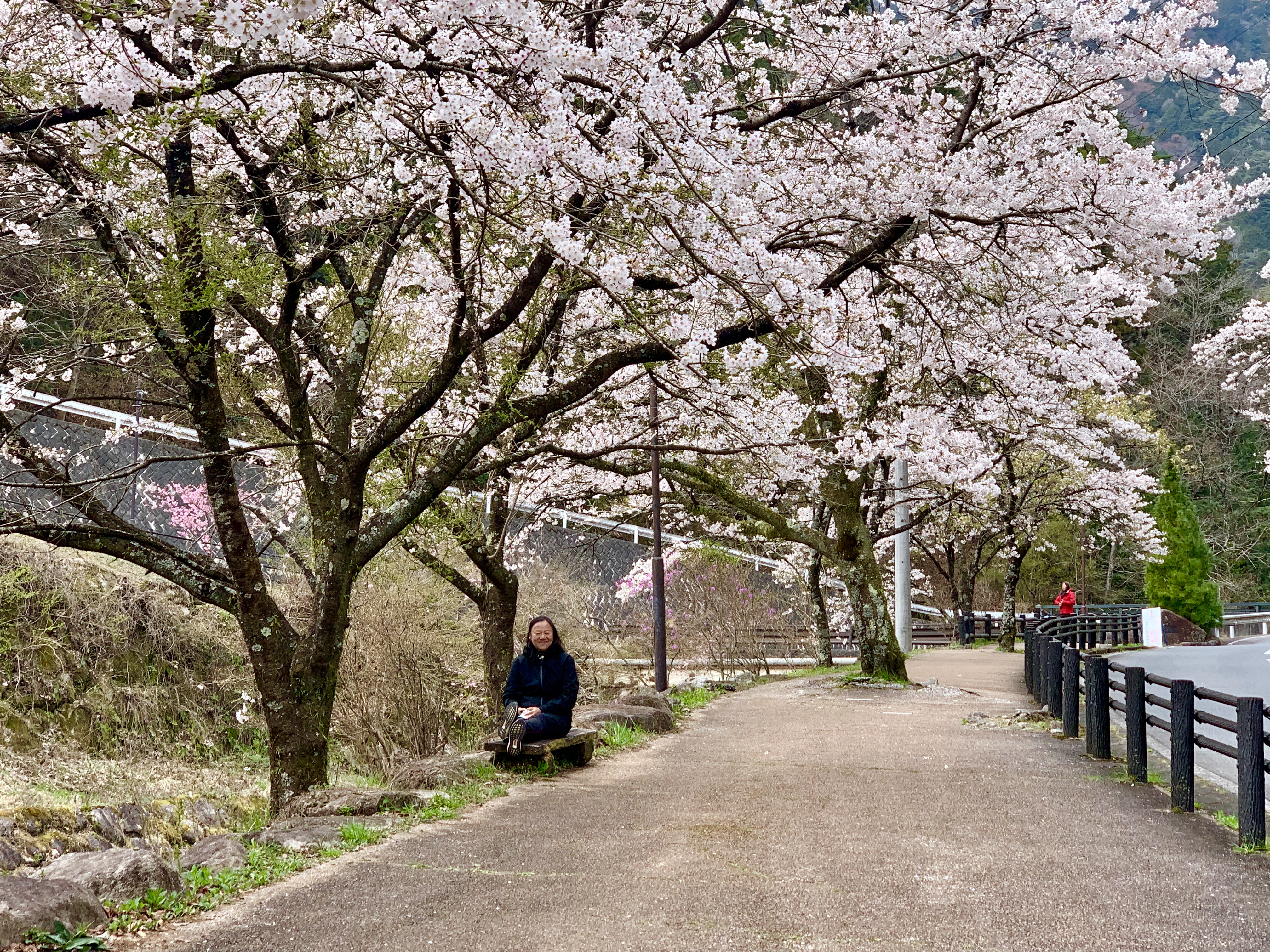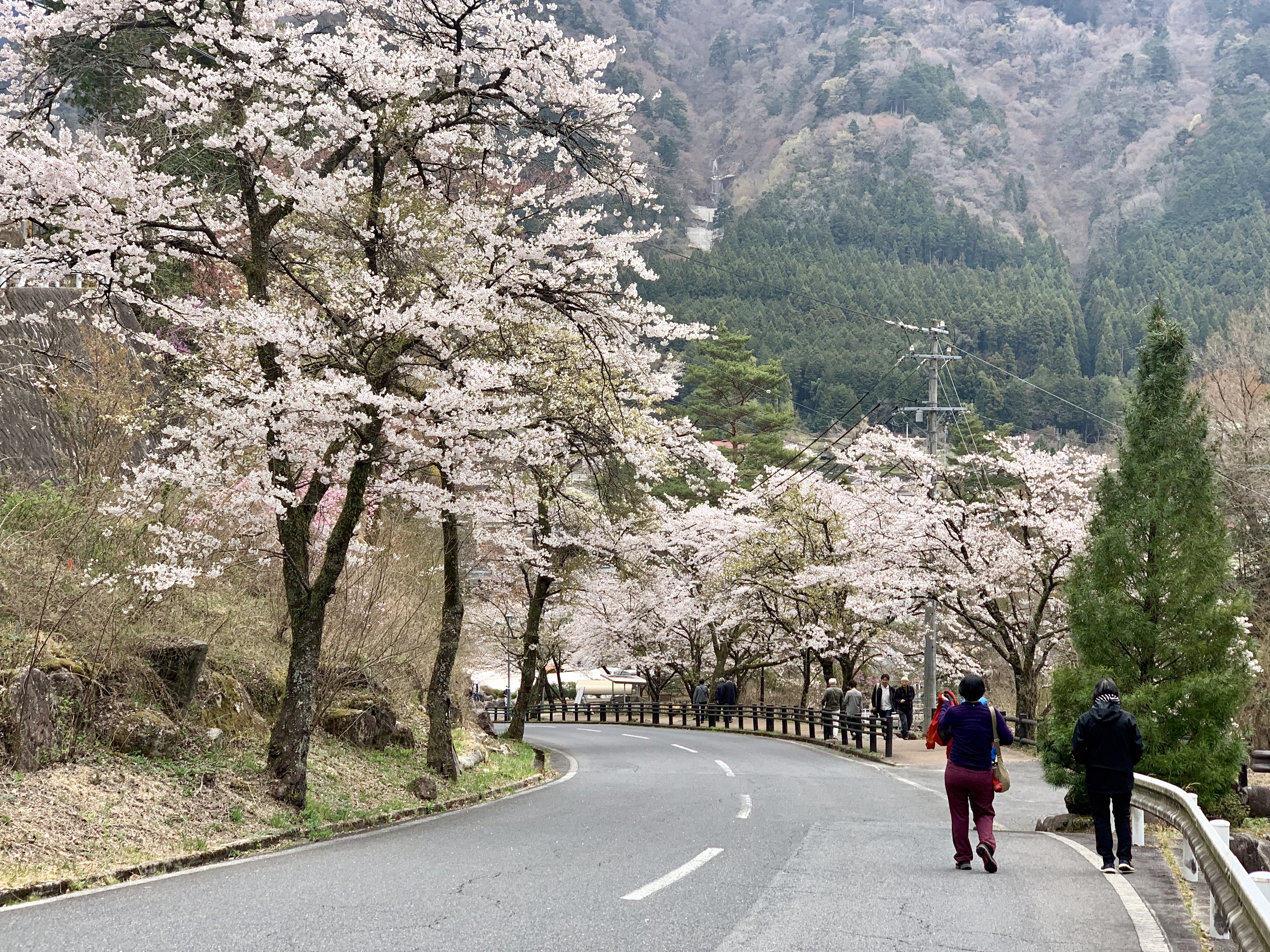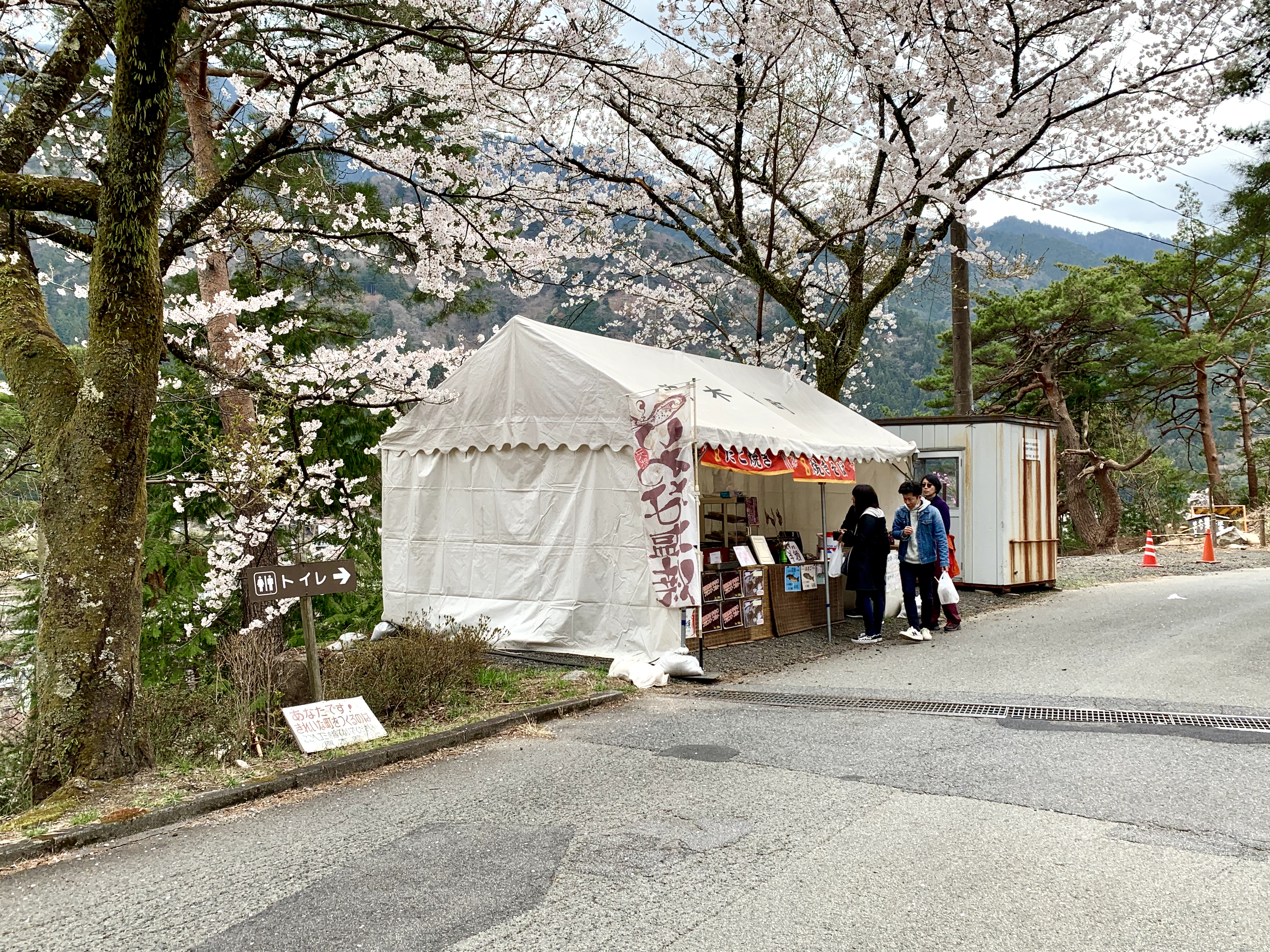 It was a brief 10-minute walk to the bridge from Nagiso Station and with the Sakura in bloom, very picturesque. Crossing the bridge, it was another 10 minutes uphill to the Tenpaku Park for some nice photos of the Azaleas. Happy were we to discover some food stalls set up there where we supported the locals selling onigiri, takoyaki, yakisoba and grilled river fish.