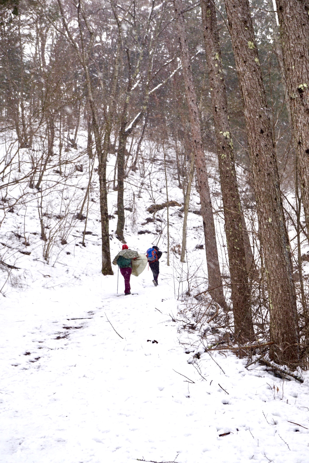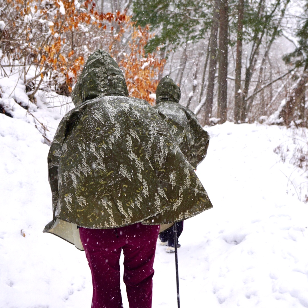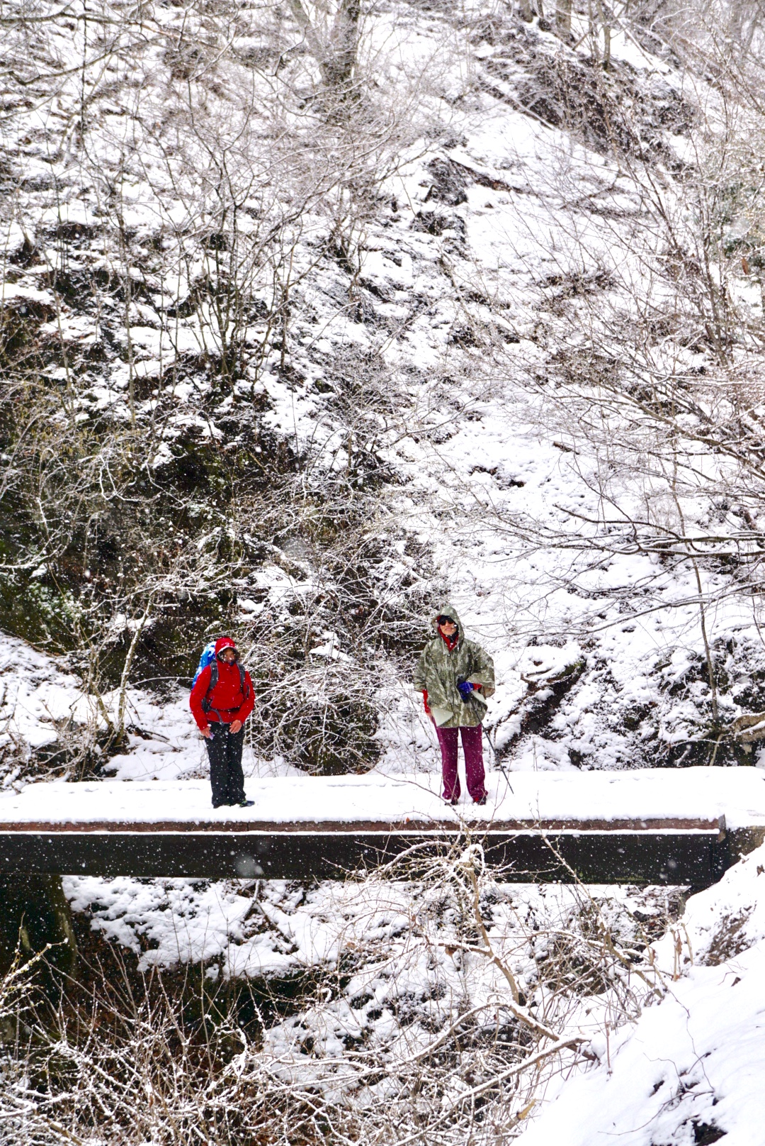 Delicate snowflakes turned into a snow shower and when that starts pelting you in the face while you are negotiating the uphill in a series of switchbacks, things get a bit tiresome. This was when the ponchos hastily purchased from a 300 yen shop in Kyoto, came in really useful. At the base of the Torii-Touge Pass (around 1,000 metres), we were faced with something like a blizzard and had to decide whether to press on further up over the pass or to pass it by. Our inner auntie feared a white-out at the top so we decided to give it a pass in the end. Live to walk another day, we thought. Here is a snapshot of our walk in the snow:-